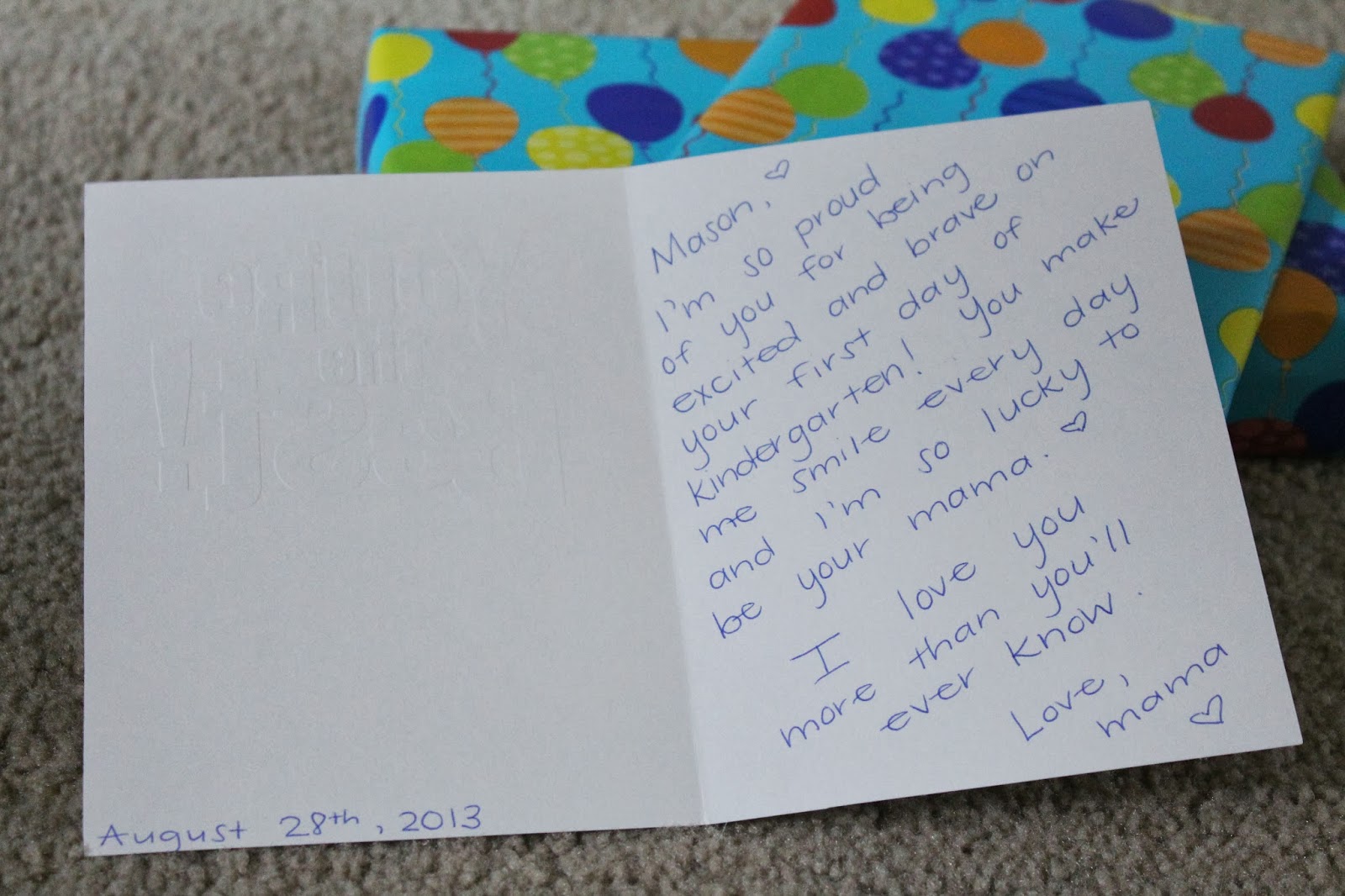 So I wrapped them up. A first day of school present. And when Mason got off that bus, running across the road screaming "mamaaaa!", I swear I've never been happier to see him. It was a rough seven hours.
